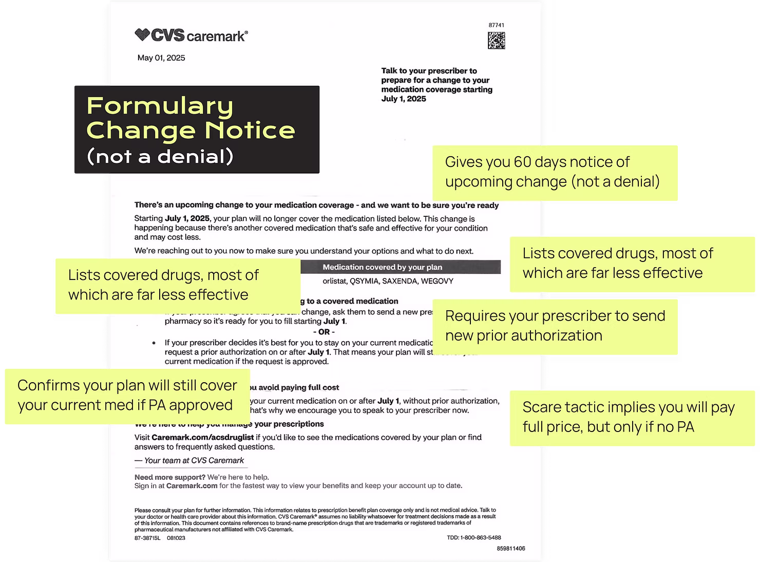 The truth? There’s not a lot in here. These letters often use vague language like “no longer be covered” and “you’ll need to pay the full cost”, but don’t provide specifics. That’s because, importantly, this is not a denial, which is required to provide you much more detail.